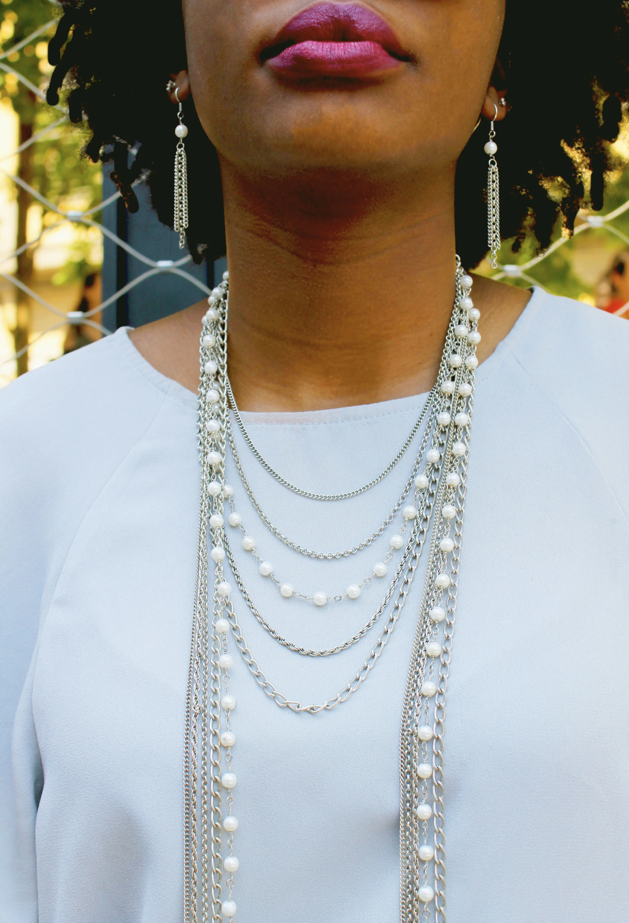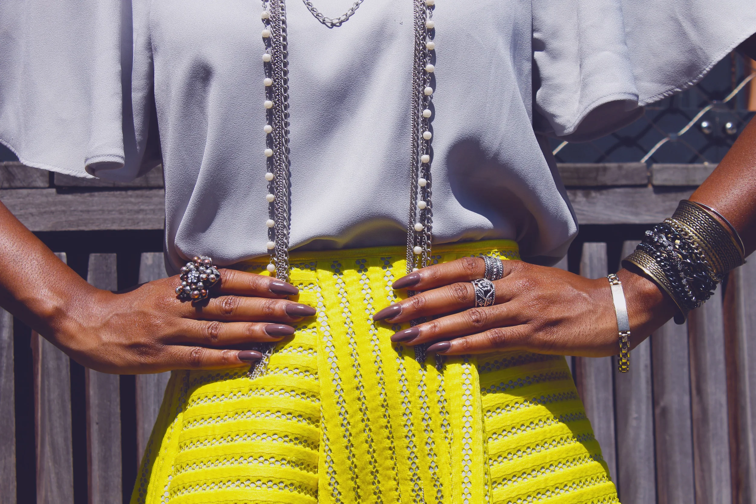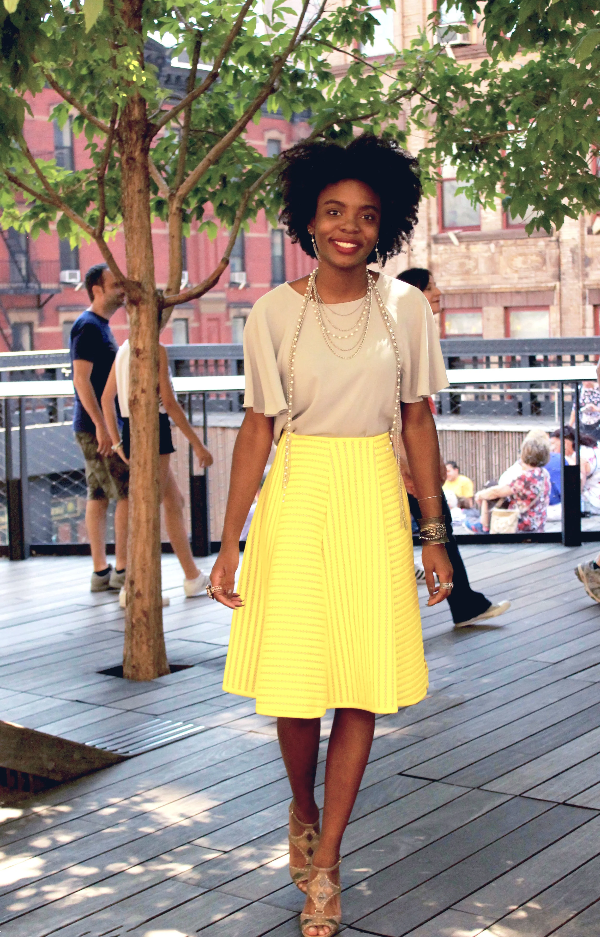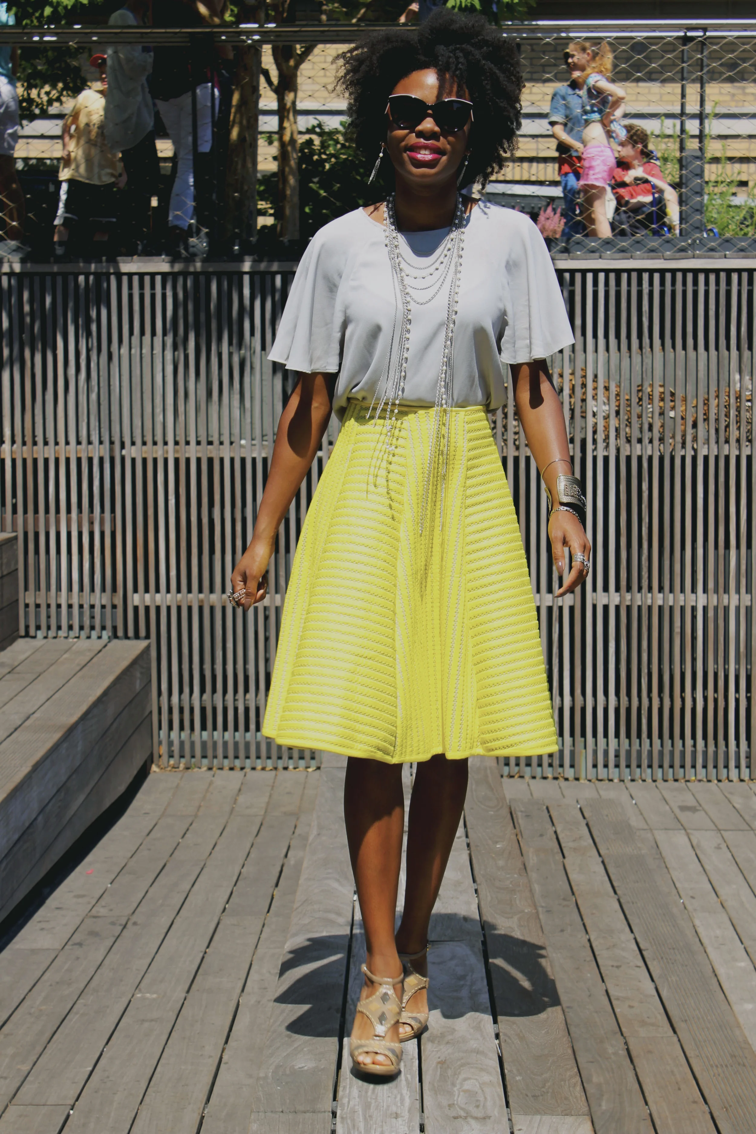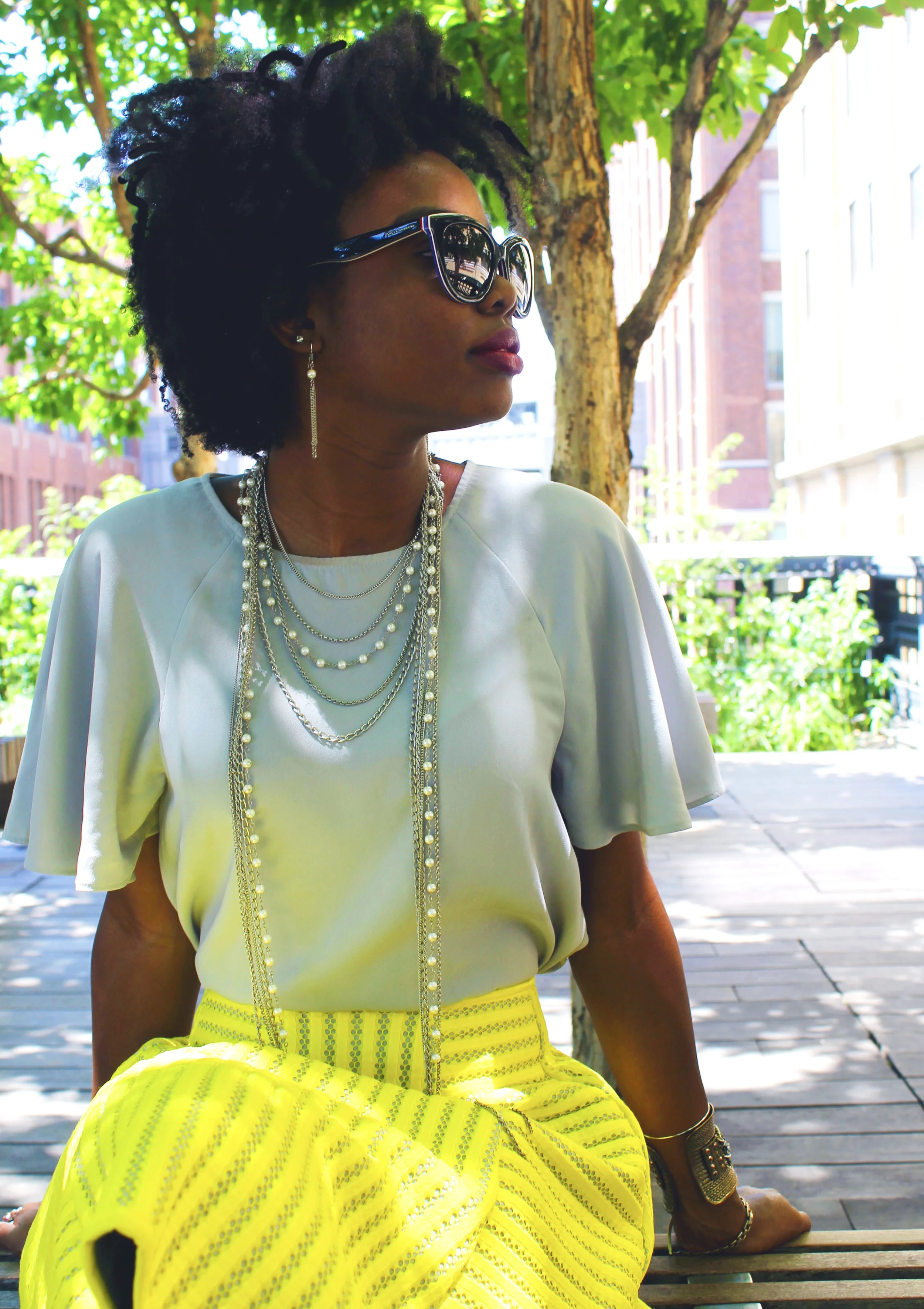 Shirt: Philosophy; Skirt: H&M; Shoes: Worthington's; Earrings: Macy's; Necklace: Macy's; Sunglasses: Dolce & Gabanna