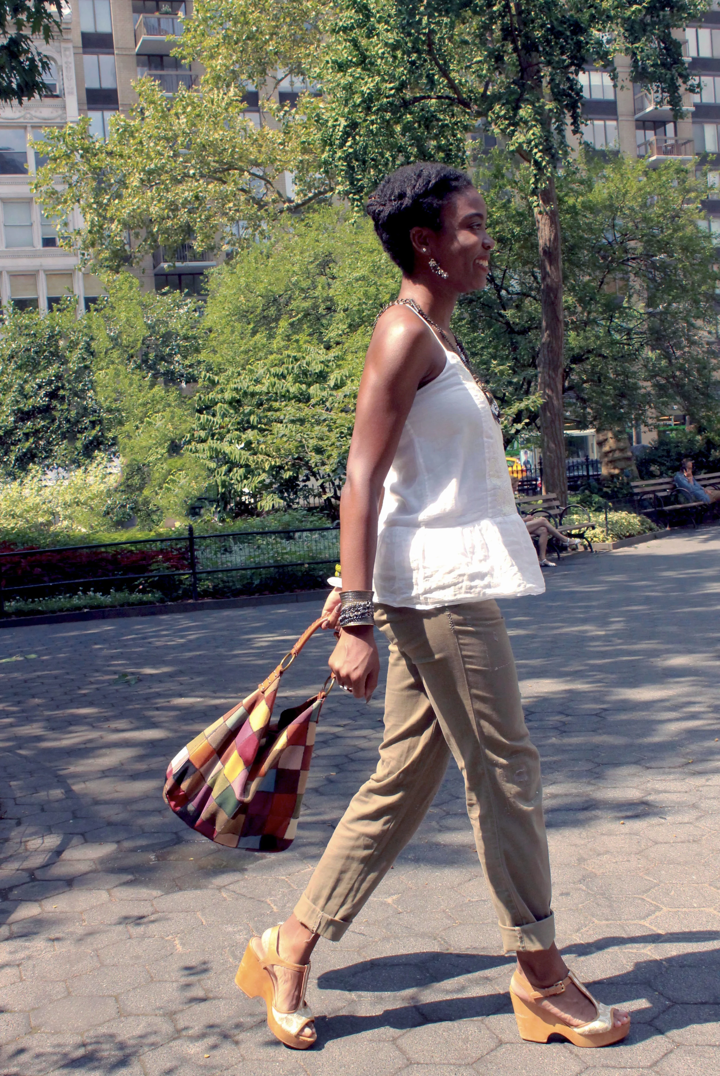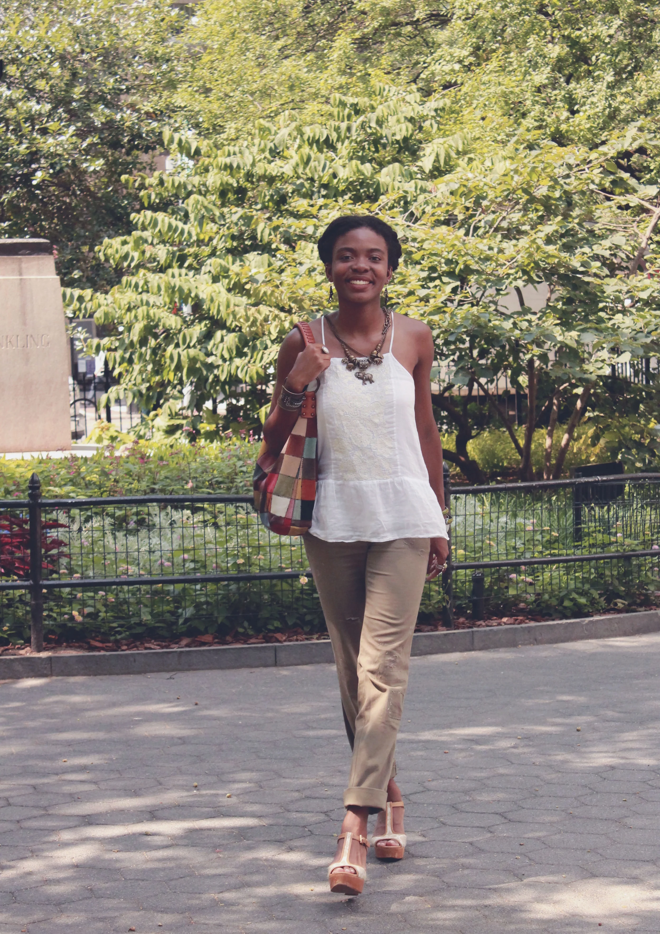 Shirt: Banana Republic; Pants: American Eagle; Shoes: Coach; Bag: Lucky Brand; Necklace: Twin Elegance Jewelry
