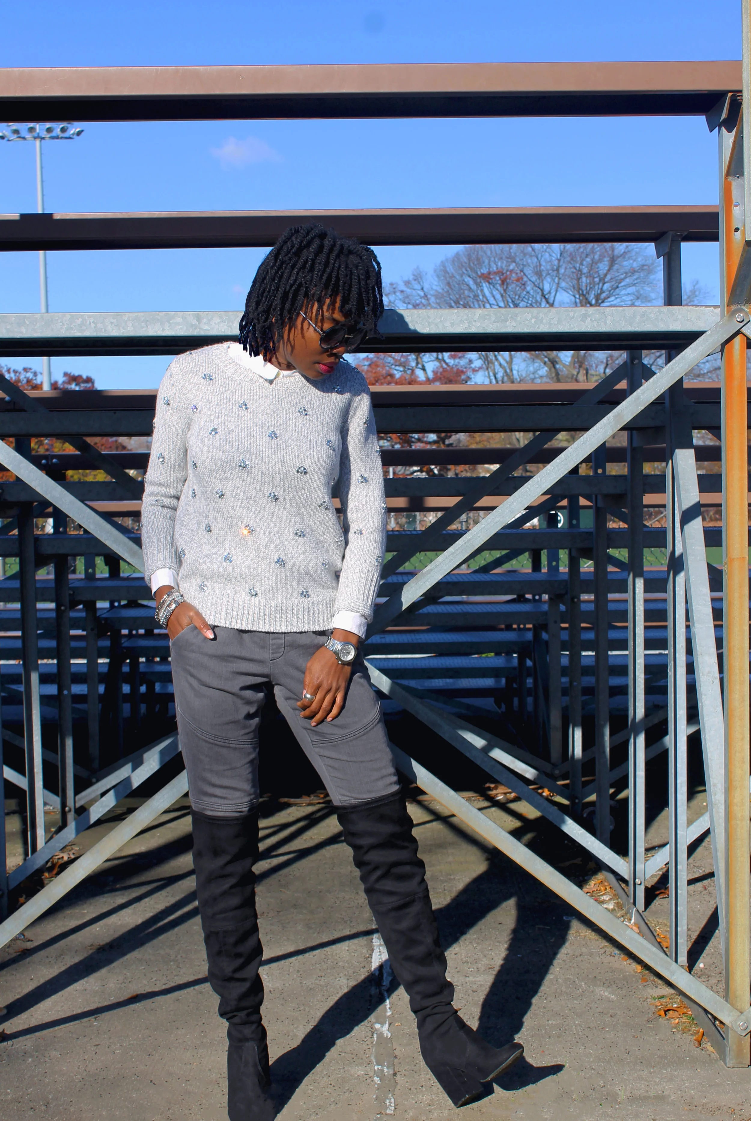 Shirt: Banana Republic; Sweater: Banana Republic (see here); Pants: Banana Republic; Boots: Steve Madden (c/o Macys); Sunglasses: Steve Madden